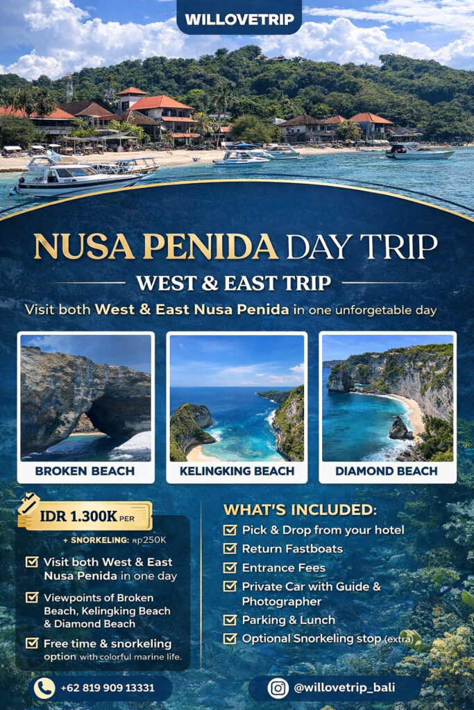 Discover the best of Nusa Penida in one unforgettable day with our West & East Island Day Trip by WILLOVETRIP Bali. This carefully designed tour takes you to some of the island’s most breathtaking viewpoints, dramatic cliffs, and iconic beaches.